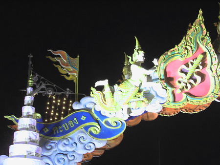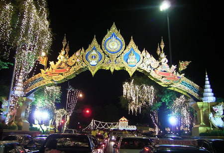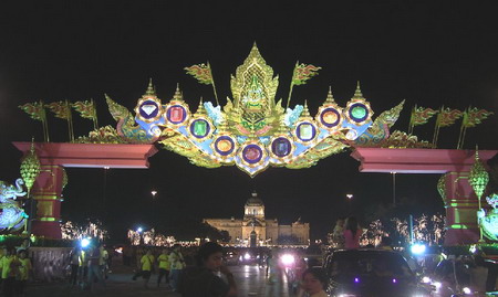 ที่จริงใจผมอยากจะไปเดินดูและเดินถ่ายรูปของซุ้ม มาให้ดูกันให้เต็มอิ่มไปเลย แต่ตอนนี้สังขารไม่ค่อยอำนวยเพราะคิดดูแล้วว่า ถ้าจะถ่ายรูปให้สวยนั้นต้องถ่ายทั้งกลางวัน เพื่อให้เห็นรายละเอียดต่างๆ ให้ชัดเจน และถ่ายทั้งกลางคืน ให้เห็นความสวยงามของแสงสี ซึ่งต้องเดินกันยาวเลยทั้งวัน คงไม่ไหวแน่ๆ เลยต้องตามไปดูของคนอื่นเขา แล้วก็เลยรวบรวมมาฝากให้ดูกันด้วย สำหรับคนที่ไม่มีโอกาสได้ไปดูของจริงเหมือนผม ไม่ว่าจะอยู่ตจว. หรือตปท. แต่ผมจะนำชมเฉพาะซุ้มที่ตั้งอยู่ในแนวถนนราชดำเนินนอกไปจนถึงหน้าลานพระบรมรูปทรงม้า เท่านั้นนะครับ คือส่วนของซุ้มเฉลิมพระเกียรติ ที่จัดเป็นซุ้มขนาดใหญ่คร่อมถนนไว้ และแต่ละซุ้มก็ออกแบบตกแต่งไว้อย่างสวยงามมากทีเดียว ที่จริงใช้งบประมาณมากๆนี่ น่าจะทำให้เป็นซุ้มถาวรไปเลย ไม่ใช่ทำรื้อ ทำรื้อ เสียของเปล่าๆ